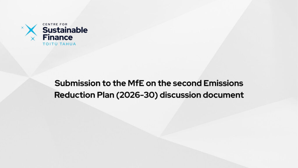 A low emissions economy is core to Aotearoa New Zealand’s economic value proposition, and sustainable finance plays a crucial role in enabling the transition. The Centre for Sustainable Finance: Toitū Tahua (CSF) believes that successful government interventions to increase investment in sustainable or decarbonisation activities should involve a combination of regulatory, financial, and market-driven approaches. […]
