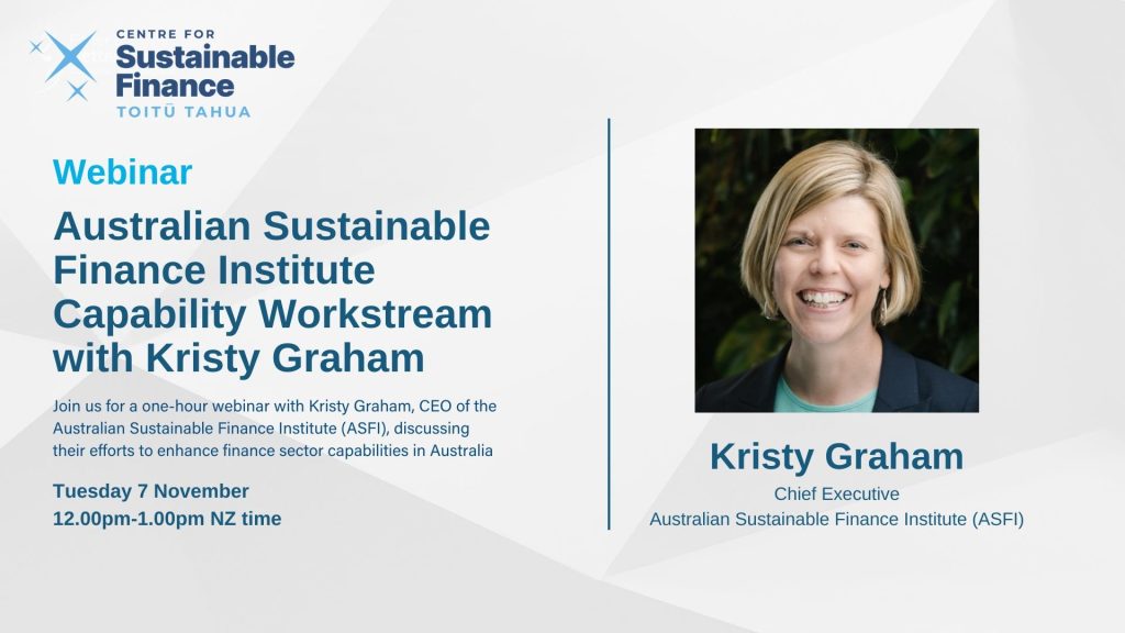 The Centre was pleased to host Kristy Graham, Chief Executive Officer of the Australian Sustainable Finance Institute (ASFI), for a one-hour webinar on ASFI’s capability workstream. The Centre has a strong working relationship with ASFI, with knowledge and insights exchanged regularly, to enable the transition to a resilient, net-zero future in Aotearoa New Zealand and […]